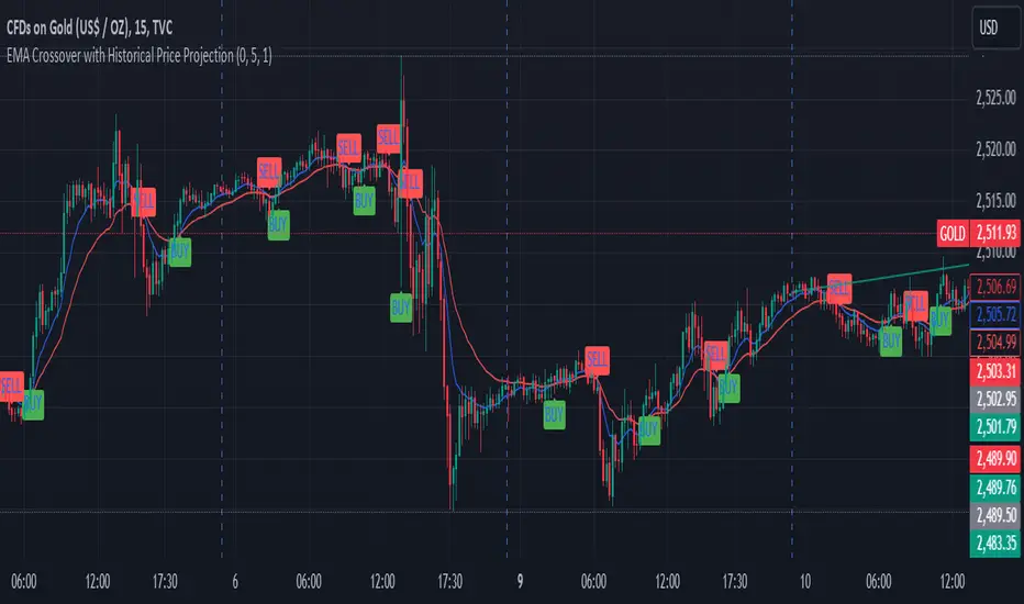 This Pine Script code builds an indicator called EMA Crossover with Historical Price Projection that combines two components: