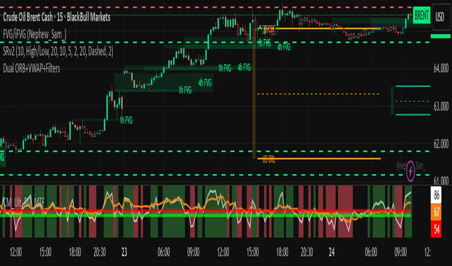 This script plots two configurable Opening Range Breakouts (ORB)—one for the European open and one for the US open—along with a color-adaptive VWAP (green above price, red below). It’s designed for M5/M15 intraday trading on indices (e.g., US100) and metals (e.g., XAUUSD), with clean visuals, optional history retention, and simple breakout cues.