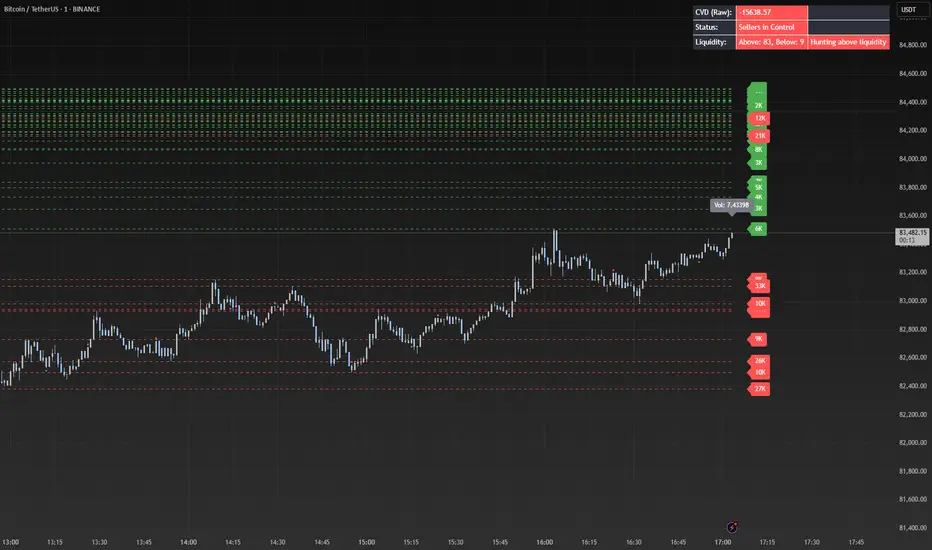 Added a new column to the top-right table that indicates whether the market is potentially "Jager below liquidity" (hunting liquidity below the current price). This is triggered when there are more liquidity levels below the price than above, combined with a negative raw CVD value, suggesting a possible downward move to target stop-loss orders. The indicator displays "Jager below liquidity" or "No" to assist with scalping and trade timing.Информация о релизе