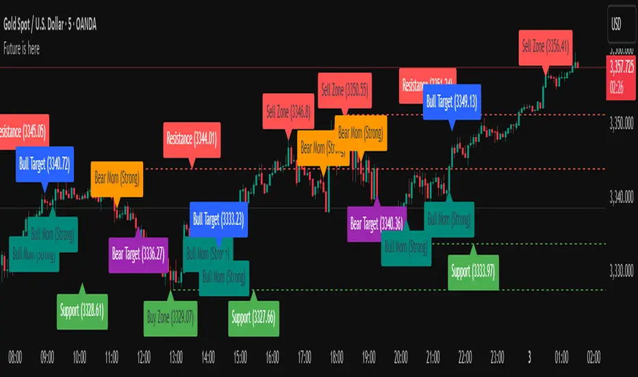 "Future is Here" is an original, multi-faceted Pine Script indicator designed to provide traders with a comprehensive toolset for identifying high-probability trading opportunities. By integrating volatility-based entry zones, trend-based price targets, momentum confirmation, dynamic support/resistance levels, and risk-reward ratio (RRR) calculations, this indicator offers a cohesive and actionable trading framework. Each feature is carefully designed to complement the others, ensuring a synergistic approach that enhances decision-making across various market conditions. This script is unique in its ability to combine these elements into a single, streamlined interface with clear visual cues and customizable alerts, making it suitable for both novice and experienced traders.
