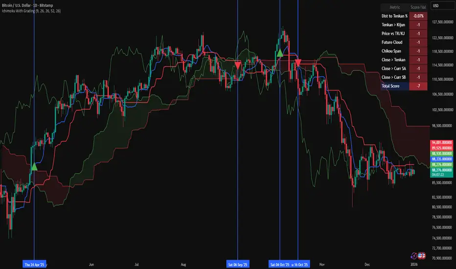 The core of this script is a 7-Point Grading System. Instead of relying on a single crossover, the script evaluates 7 distinct Ichimoku conditions simultaneously.