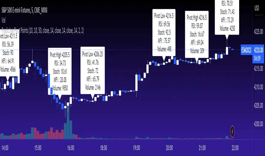 Well, Pivot Points (PP) are useful but delayed. So the premise of this indicator is pretty simple. It stores variables from previous Pivot Highs and Pivot Lows (RSI, MFI, Stochastics and volume) and then looks for like circumstances to trigger early pivot alerts based on historic pivot traits.