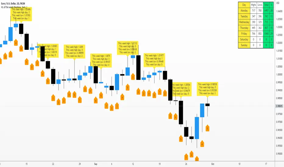 This indicator plots a table of the frequency of which day the week the high-of-the-week and the-low-of-the week are formed.