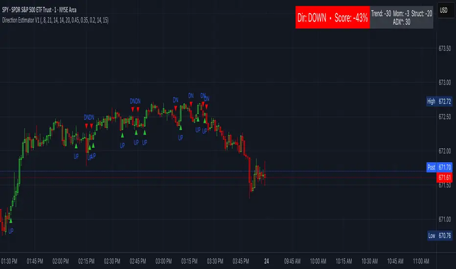 The Universal Direction Estimator V1 is a Pine Script v6 indicator that unifies Trend, Momentum, and Market-Structure readings into a single normalized score ranging from −1 to +1. It can optionally reference a higher timeframe (HTF) for confirmation and apply a custom Wilder-style ADX confidence boost to highlight conditions where directional bias is statistically stronger.
