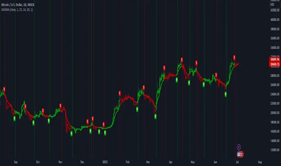 ASGMA serves as a trend-following indicator, identifying both bullish and bearish trends. It provides buy and sell signals indicated by "B" and "S" labels plotted alongside the price data. Additionally, the ASGMA's Exponential Moving Average (EMA) line alternates between green and red, indicating bullish and bearish momentum, respectively.