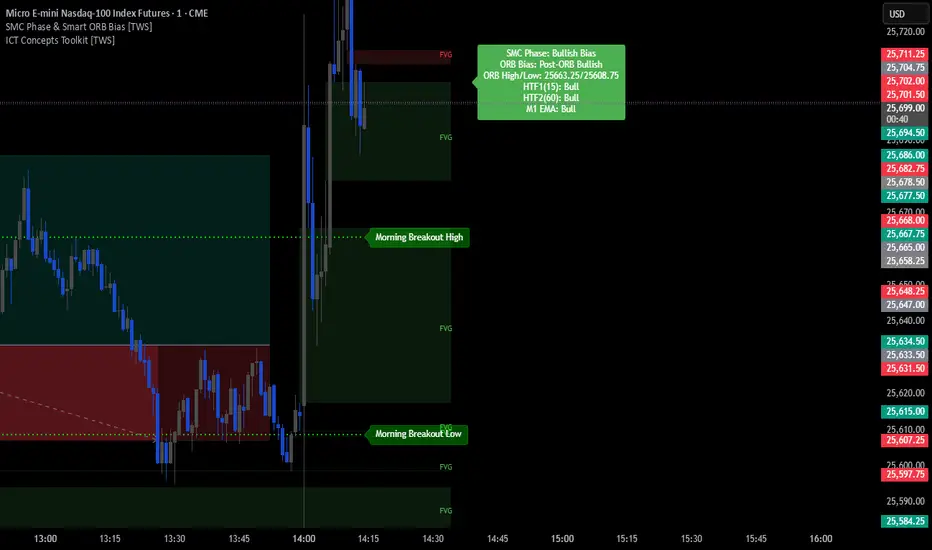 Unlock the power of Smart Money Concepts (SMC) combined with the classic Opening Range Breakout (ORB) strategy—all in one powerhouse indicator! Perfect for traders who want high-probability bias detection with visual clarity and multi-timeframe confirmation.