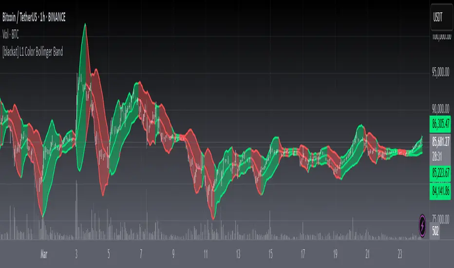 OVERVIEWDynamic Bollinger Band indicator with color transitions reflecting volatility and trend direction. Combines 13-period SMA-based bands with real-time adaptation to market conditions.