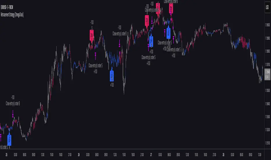 Retracement Strategy [OmegaTools] is a systematic trend–retracement framework designed to identify directional opportunities after a confirmed momentum shift, and to manage exits using either trend reversals or overextension conditions. It is built around a smoothed RSI regime filter and a simple, price-based retracement trigger, making it applicable across a wide range of markets and timeframes while remaining transparent and easy to interpret.
