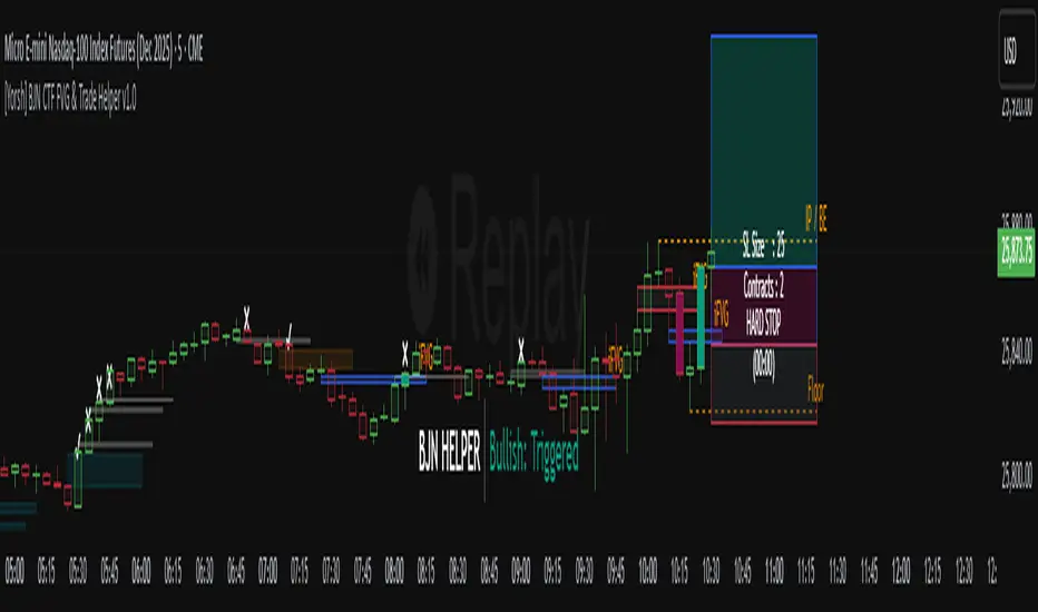 The [Yorsh] BJN CTF FVG & Trade Helper v1.0 is an advanced, systematic trading tool designed for precision and objectivity in the futures market. Built on the high-speed PineScript v6, this indicator moves beyond simple FVG plotting by integrating a complete, rules-based trade execution model known as the "iFVG" (inverted Fair Value Gap) setup.