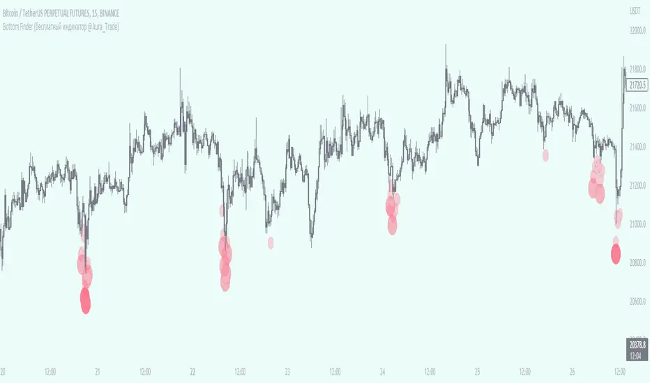🖥 Bottom Finder - индикатор, дающий сигналы, когда цена находится на локальном или глобальном дне. Он определяет дно в 80+% случаев. Чем больше и непрозрачнее круг - тем больше вероятность, что цена на дне! Также можно поставить оповещения. Работает на любых монетах и таймфреймах