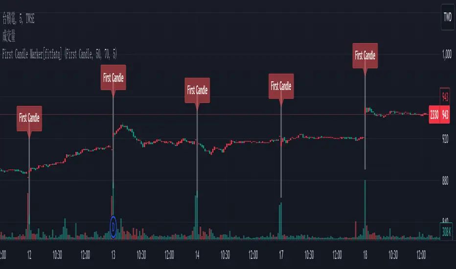 This script is designed to mark the first candle of each trading day on the chart. It provides both a label and a vertical line as options to visually highlight the first candle.