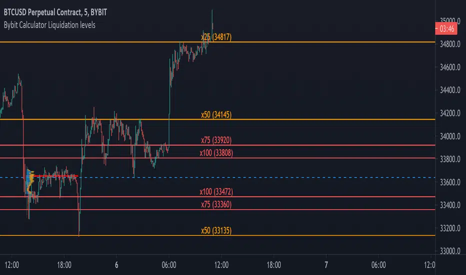 Given an entry price and a leverage, the calculator will give you a liquidation price. Those liquidation prices are displayed by this script.