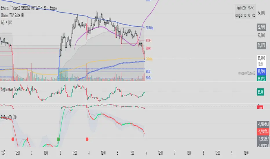 普通的 CVD(累积成交量差)往往噪音很大,线条锯齿状严重,导致交易者难以看清真正的资金流向趋势。本指标通过线性回归算法 (Linear Regression) 对 CVD 进行平滑处理,并结合标准差通道 (Standard Deviation Channel),试图解决两个核心问题: