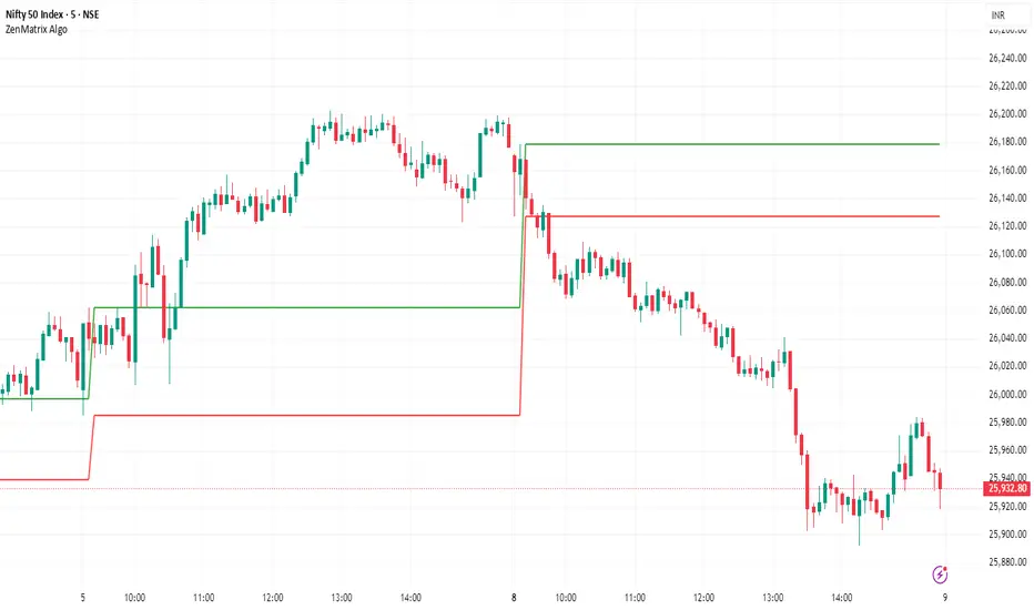 ZenMatrix Algo automatically identifies the early market range for each trading day and plots clean horizontal support and resistance levels based on that range designed by Finovatech Solutions.