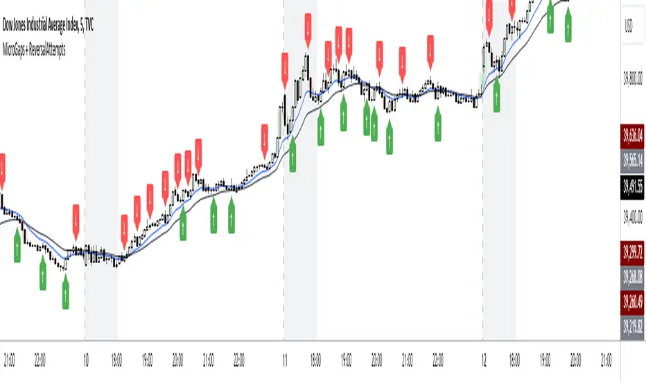 The "MicroGaps + ReversalAttempts" is a custom TradingView indicator that identifies and visualizes micro gaps, detects reversal attempts after gaps, and optionally plots moving averages and the first-hour trading range. The indicator plots micro gaps as boxes on the chart and marks potential reversal attempts with arrows.