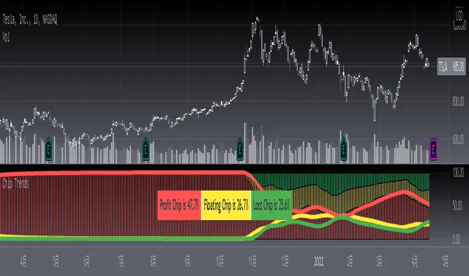 This is a chip distribution and trend indicator I developed that consists of three different colored histograms. Yellow represents the percentage of floating chips, green represents the percentage of hold-ups, and red represents the percentage of profit. Among them, the more red columns, the more profitable chips, the more green columns, the more trapped chips. At the same time, I used three colored moving averages to represent the trends of these three types of chips for reference. At the same time, a table will appear in the middle of the indicator, indicating the chip ratio value of the latest bar in the form of a percentage.