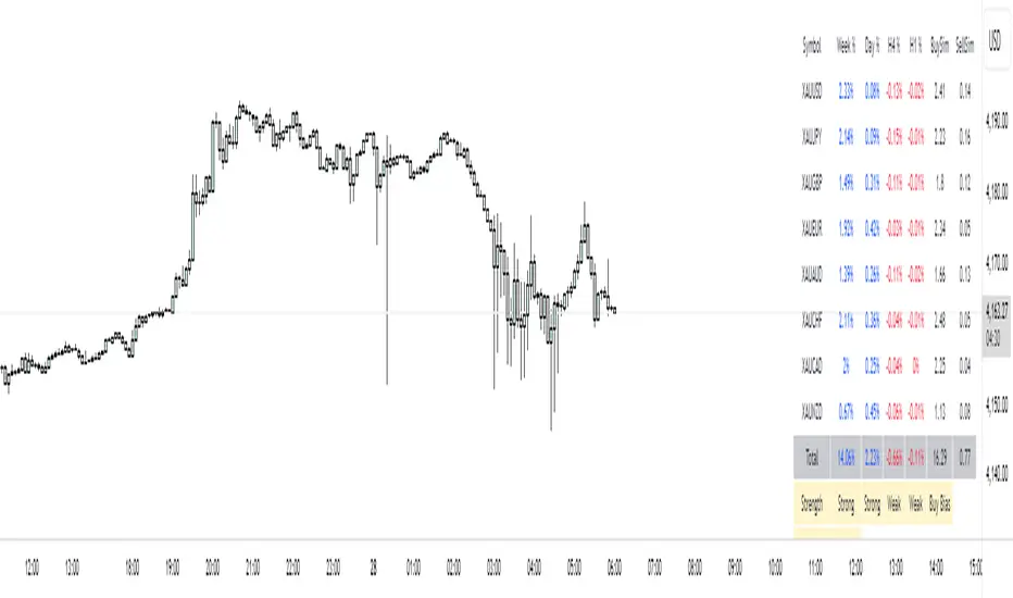 The results are compiled into a ranked table, so symbols automatically reorder themselves based on current strength. This dynamic ranking allows traders to quickly spot the most dominant indices and adjust their strategy accordingly. The table is fully visual and easy to read, with distinct coloring for up and down momentum, providing both clarity and speed for decision-making.