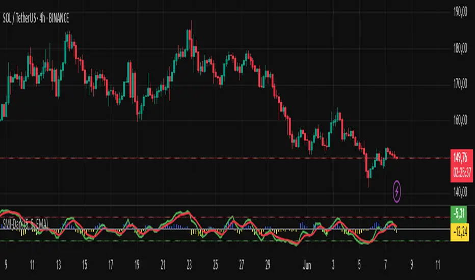 The SMI-Darkness is an indicator based on the Stochastic Momentum Index (SMI), designed to help identify the strength and direction of an asset's trend, as well as potential buy and sell signals. It displays a smoothed SMI using multiple moving average options to customize the indicator’s behavior according to the user’s trading style.
