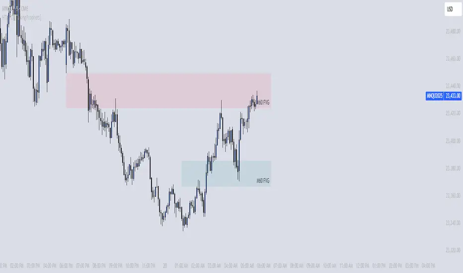 OverviewThe HTF Fair Value Gaps (FVG) indicator is a powerful tool designed for Forex and Futures traders utilizing Smart Money Concepts (SMC) and ICT (Inner Circle Trader) methodologies. This indicator automatically detects Fair Value Gaps (FVGs) across multiple timeframes, helping traders identify institutional footprints, price inefficiencies, and potential trade setups.