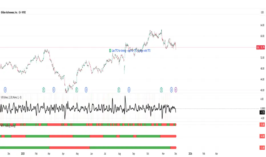 This indicator provides a clear visual representation of trend direction across three timeframes. It helps traders identify trend alignment, potential reversals, and optimal entry/exit points by analyzing the relationship between different smoothed timeframes.