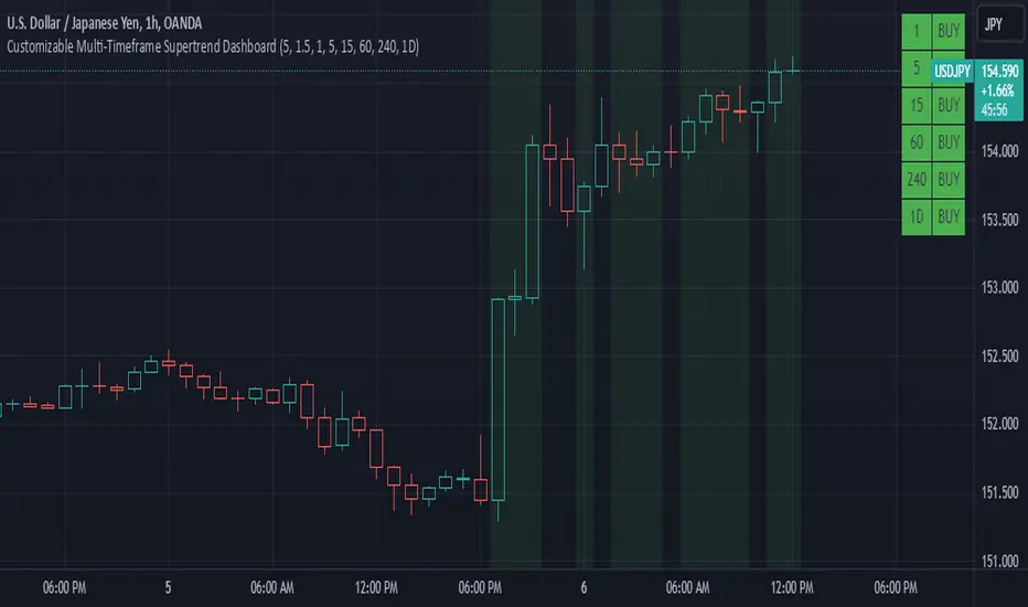 BUY (Green): The current timeframe’s price is in an uptrend based on the Supertrend calculation.