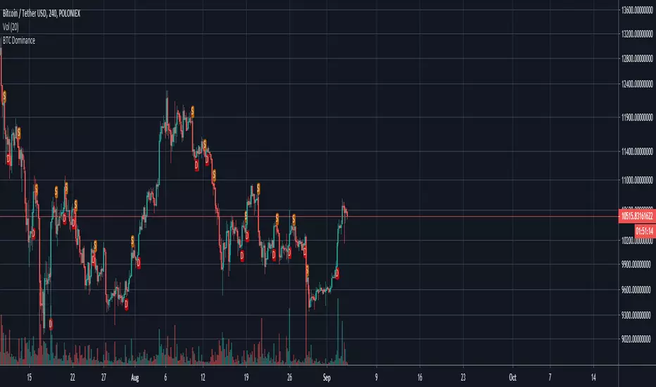 This script calculates the BTC dominance and adds markers as overlays on top of your crypto chart.