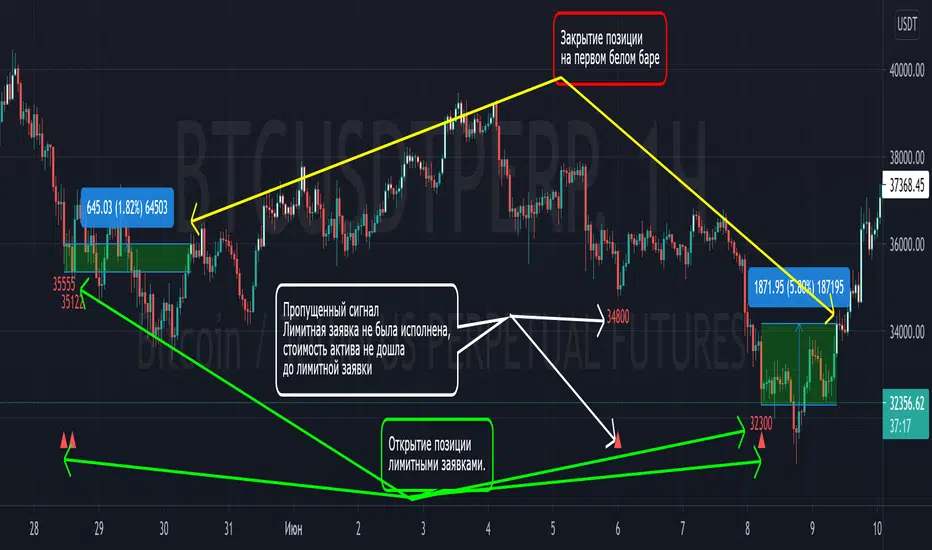При повторении сигнала необходимо добрать позицию для усреднения и выходить с позиции при первом белом баре выше средней точки входа.