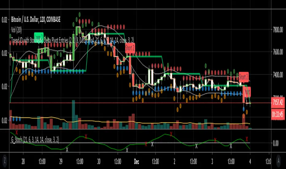 The indicator is designed to identify the trend for longing or shorting, and then provides the entries based on stochastics converging or diverging (not crosses). The convergence and divergence of stochastics is amalgamated into a short EMA which also has length 6 and can be tuned by the user.