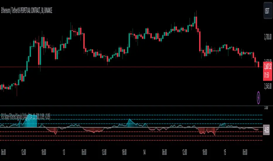 Normalized Slope: The indicator plots the normalized slope of the RSI, with values above zero indicating positive momentum and values below zero indicating negative momentum. A higher positive slope suggests a strong upward trend, while a deeper negative slope indicates a strong downward trend.