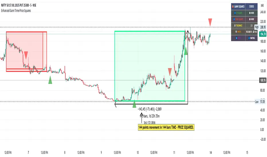 Enhanced Gann Time-Price Squares Script:This Pine Script implements W.D. Gann's geometric market theory by identifying when price and time movements achieve mathematical balance, creating powerful trading signals at market equilibrium points.