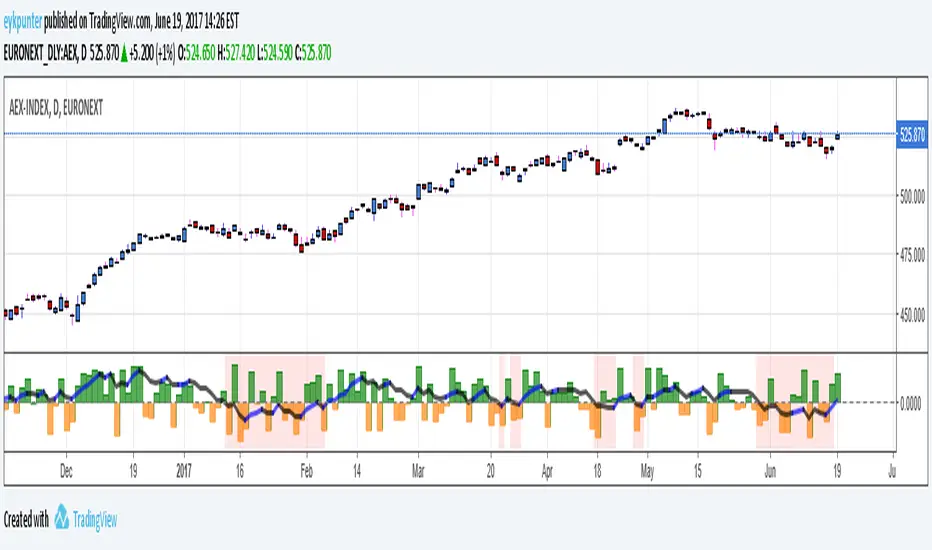 The indicator should be interpreted as a stochastics, the difference between Stochs and MACD is that stochs report inclinations, i.e. in which direction the market is edging, while MACD reports movements, in which direction the market is moving. Stochs are an early indicator, MACD is lagging. The emoline is a 30 period linear regression, I use linear regressions because these have no lagging, react immidiately to changes, I use a 30 period version because that is not so nervous. You might say that an MA gives an average while a linear regression gives an ‘over all’ of the periods.