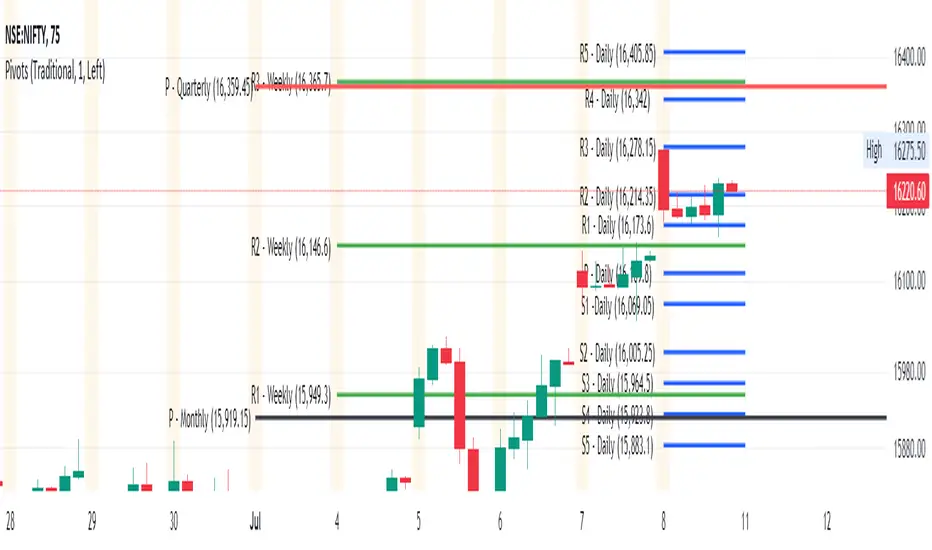 Pivots Quarterly and Pivots Yearly Timeframe addedOption to Choose the Timeframe Daily / Weekly / Monthly / Quarterly / Yearly Pivots