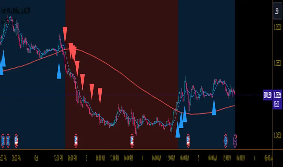 This Pine Script is designed to create a trading indicator with moving averages (MA) and relative strength index (RSI), along with arrow signals and background color changes based on those signals. Here's a description of its functions: