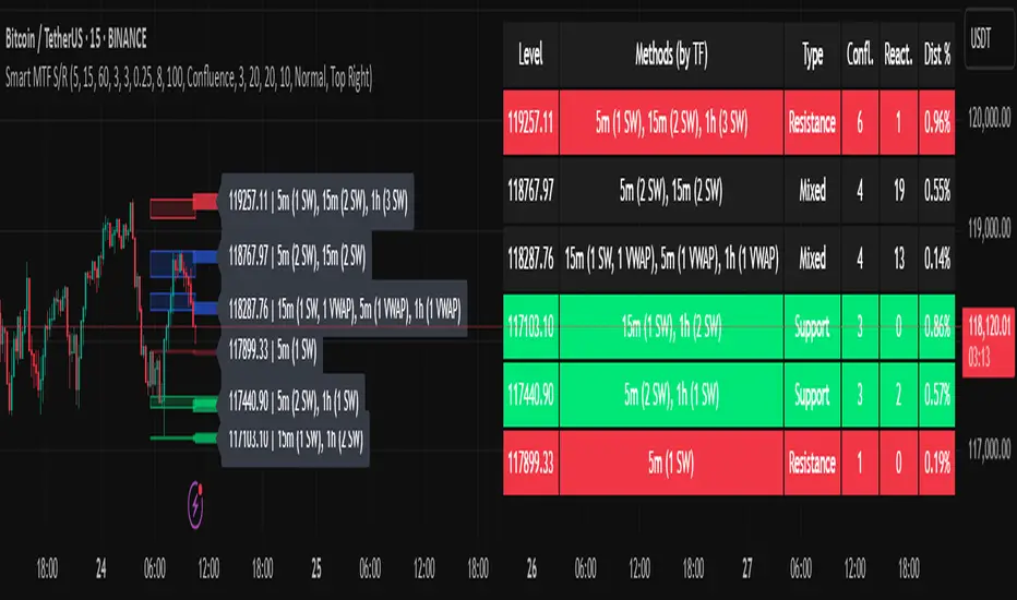 Confluence Scoring: Each zone is scored by the number of methods and timeframes in agreement, helping you instantly spot the most significant S/R areas.