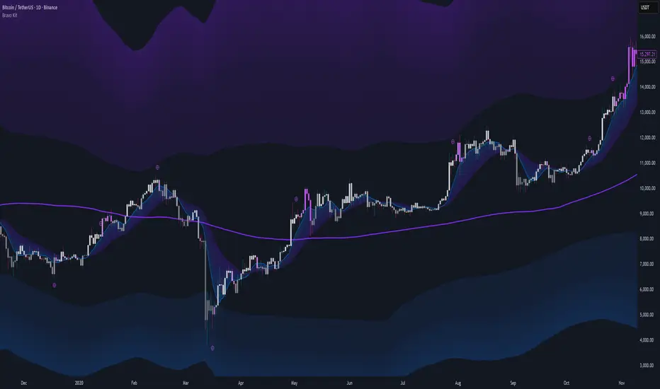 The Bravo Suite harnesses the power of Fibonacci numbers in the Bravo Fibonacci Bands by building a custom low lag weighted average from the input length. This is achieved by applying the metallic mean (also known as the "golden mean" or "silver mean") to the input series. By leveraging Fibonacci numbers in this manner, the weighted average effectively shifts more weight to the most recent values, emphasizing the importance of the current market trend.