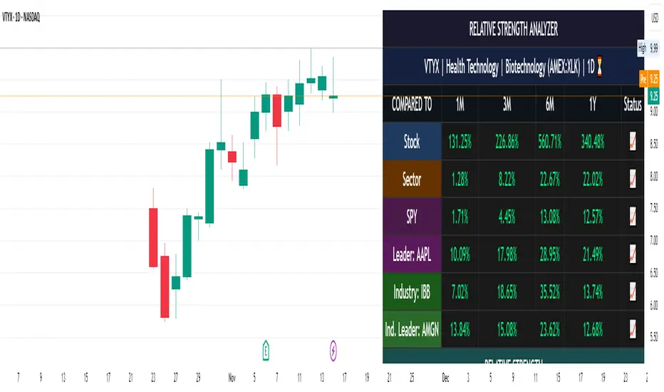The Luxy Sector & Industry RS Analyzer solves a critical problem that most traders overlook: picking strong stocks in strong sectors AND strong industries. It's not enough for a stock to go up - you want stocks that are crushing their competition at both the sector AND industry level. This indicator does the heavy lifting by automatically comparing your stock against its sector ETF, industry ETF, the broader market, sector leader, and industry leader, giving you a complete multi-level picture of relative performance.