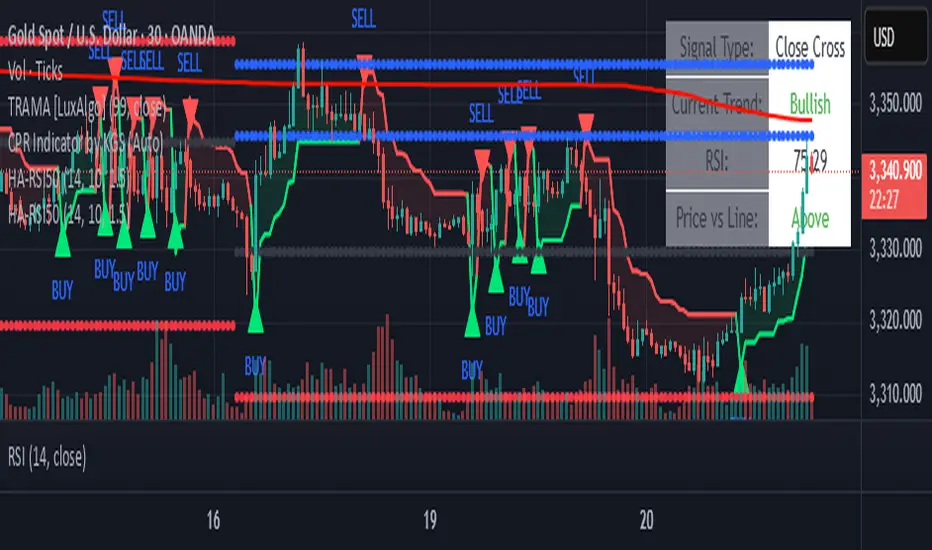 This Pine Script indicator combines Heikin Ashi candles, RSI (Relative Strength Index), and ATR-based dynamic trend lines to create a comprehensive trend-following system. It's designed to identify strong trending moves while filtering out market noise.
