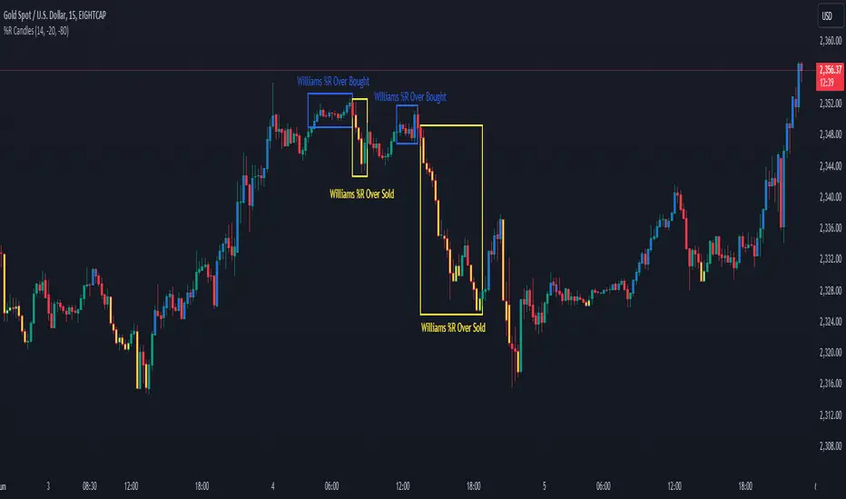 This Pine Script indicator enhances the visibility of market conditions by changing the color of the candlesticks based on the Williams %R values. It helps traders quickly identify overbought and oversold conditions without the need to display the Williams %R line or any additional bands.