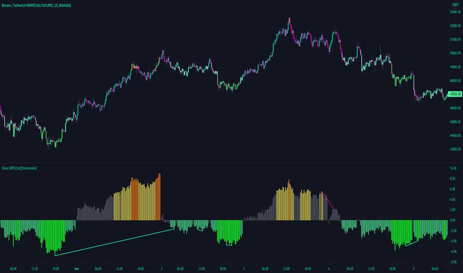 For example, by default the resolution is set to 4 hours. The oscillator will show the difference between the candle closes and the ongoing 4 hour close levels. If the candle close is above, the oscillator will be above zero, below the close, below zero.