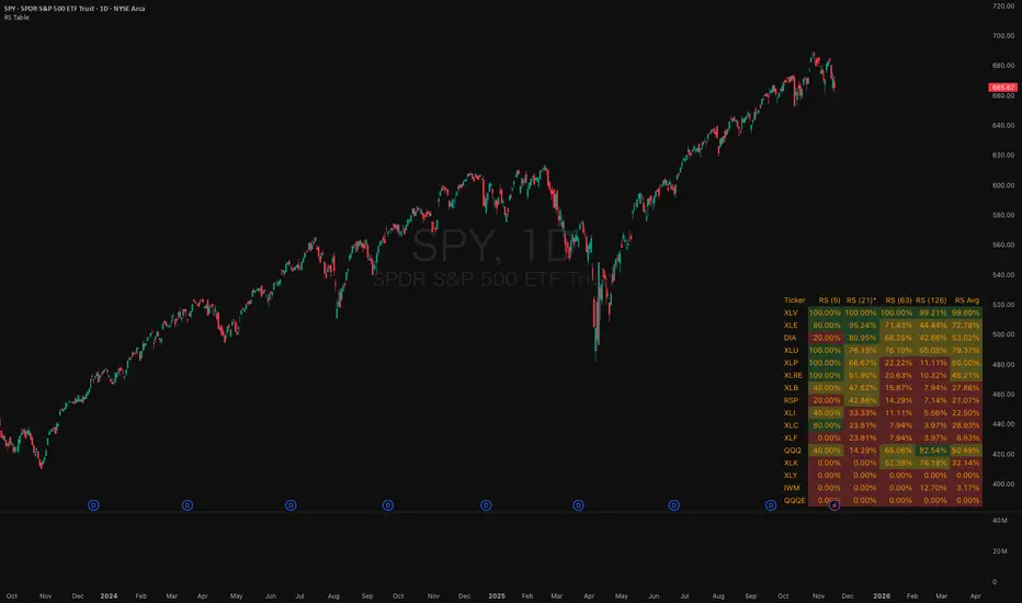 The Relative Strength Table is an indicator that compares multiple tickers against a benchmark (default: SPY) and displays their relative strength.