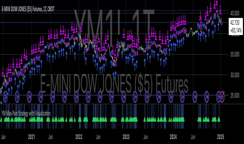 • More Contrasting Color for the Max Pain Zone Signal: The “Max Pain Zone” is now visualized with a green triangle (color.rgb(40, 210, 90)) for better visibility, compared to the simpler shape and color in the first script.