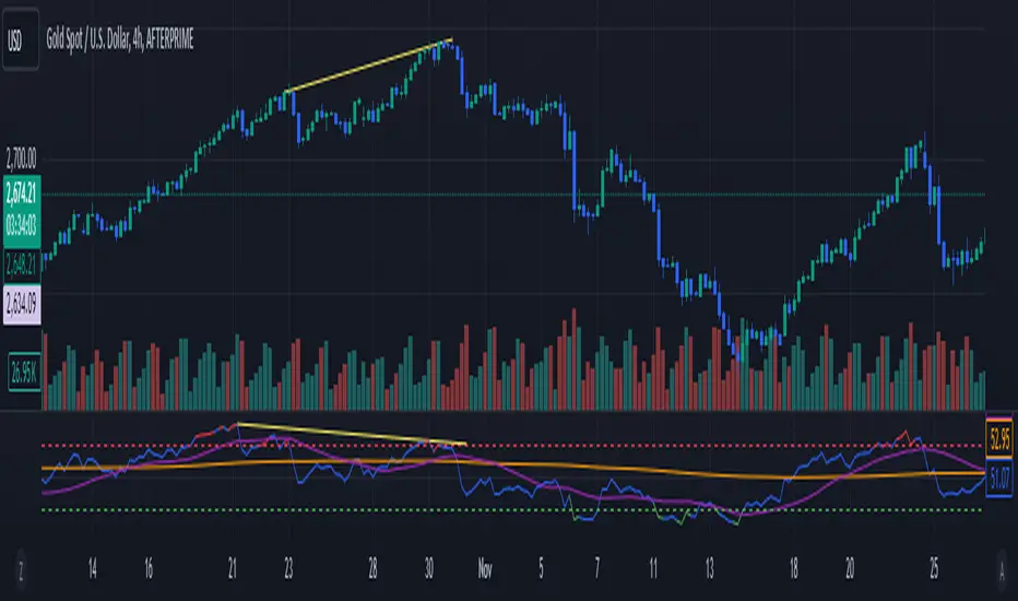 When RSI and volume conditions align, the RSI line is dynamically colored to indicate potential overbought/oversold zones.