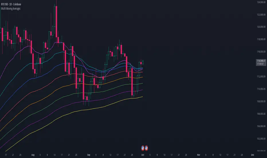 - Full Customization: For each of the eight moving averages, you can adjust the length, line width, and color to fit your visual preferences and analytical needs.