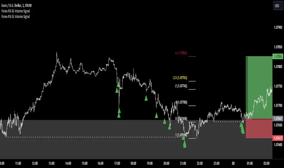 The "Forex RSI & Volume Signal" indicator combines Relative Strength Index (RSI) and volume analysis to identify potential buy signals in forex trading. It calculates RSI to gauge overbought or oversold conditions, while comparing current volume to a moving average to determine bullish volume momentum. When RSI indicates oversold conditions and volume suggests bullish momentum, a buy signal is generated. This indicator aims to identify favorable entry points during short-term uptrends in the forex market, leveraging both momentum and volume analysis to inform trading decisions. It provides traders with a comprehensive tool to identify potential buying opportunities based on multiple technical factors.