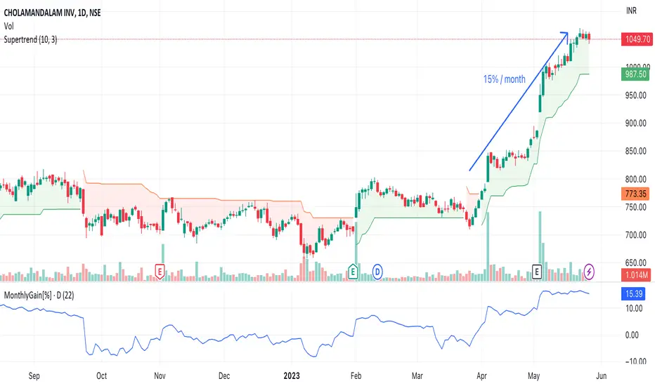 Monthly percentage gain = ((Current_Day_High_Price - 0_Day_Low_Price) * 100 / 0_Day_Low_Price) * 22 / sampling_duration