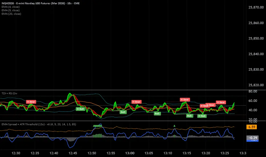 Visual indicator that flags extreme EMA divergence on the 15s chart. It plots the EMA20 − EMA4 spread, overlays a multiplied ATR threshold, and highlights bars where 20 > 9 > 4 (bear extreme) or 4 > 9 > 20 (bull extreme) and the spread ≥ mult × ATR.