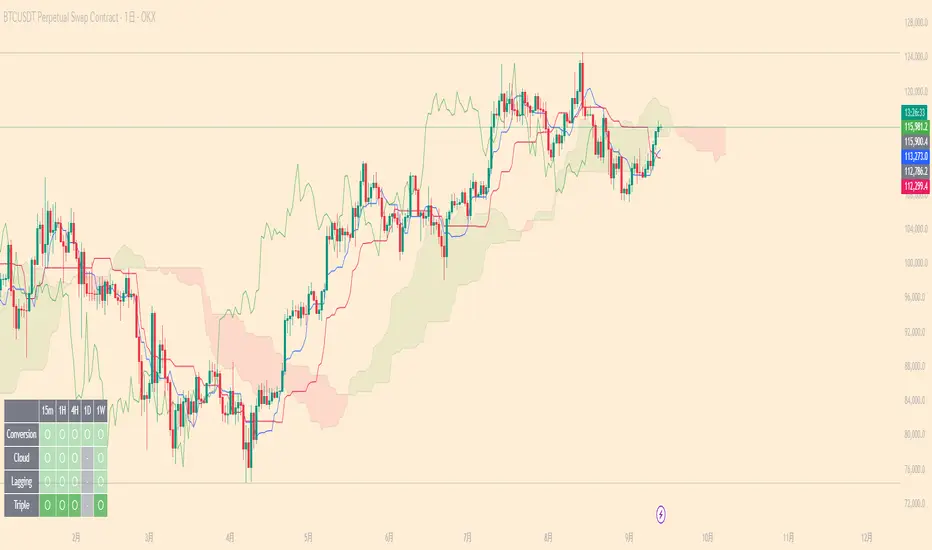 Detailed Status Display: For each timeframe, it clearly displays whether the "Tenkan-sen," "Kumo (Cloud)," and "Chikou Span" components are in a "Bullish," "Bearish," or "— (Neutral)" state, color-coded for intuitive understanding.