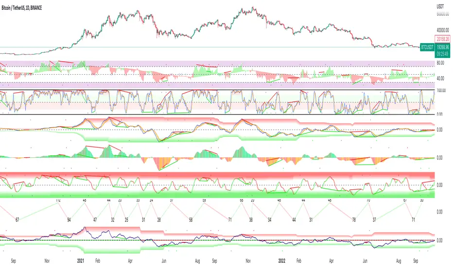 Within this one indicator you will have access to RSI, Stochastic, MACD, Awesome Oscillator, Wavetrend, Zig Zag Pivots and DPO.