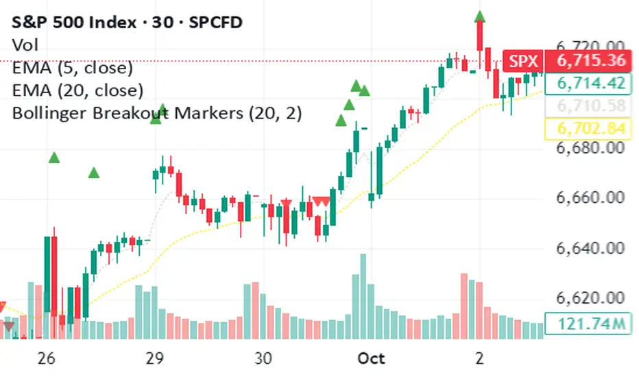 Subtle triangle markers that indicate when price extends out of the Bollinger bands to indicate overbought and oversold conditions