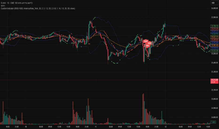 This is a hybrid trend/continuation + EMA crossover signal indicator that generates LONG/SHORT entries only when multiple filters agree. It’s built to avoid “random” signals by forcing confirmation from trend direction, volatility, and risk/reward conditions, and it can also restrict signals to a specific trading session + timezone.